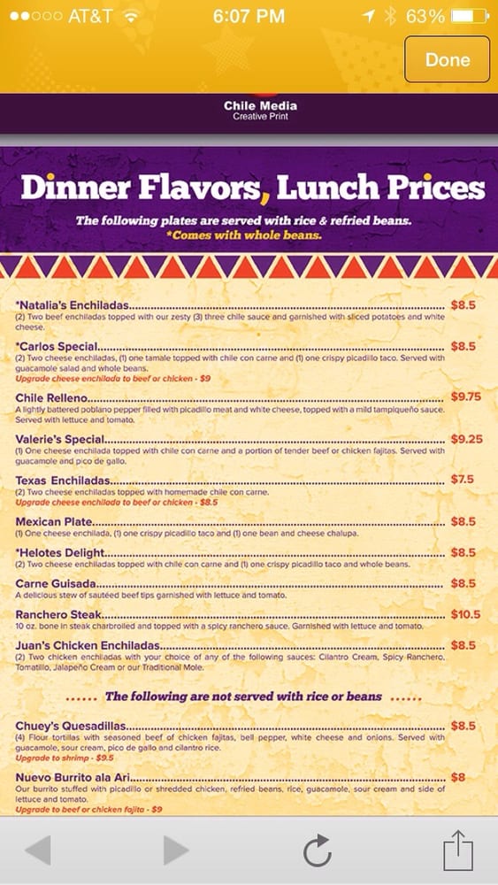 Three cheese enchiladas topped with chili con carne. Served with rice and your choice of beans.